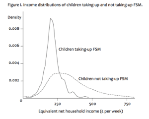 Suppose policy-makers wanted to target free school meals at poor families, regardless of whether they are in receipt of benefits or not. Can we do this effectively without giving free school meals to everyone? Well, survey data tells us that our ‘missing poor’ – the low income families who do not claim FSM – are more likely to be found in schools with FSM children and with higher levels of deprivation. So, here I try (and largely fail) to target meals at poor families by using the recorded deprivation in their school.