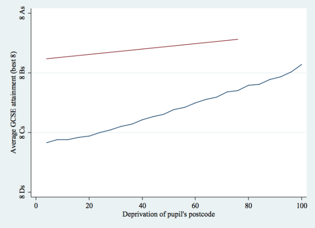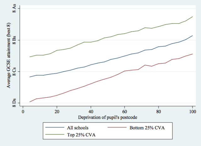 It’s not all hopeless (although it also isn’t easy). There are schools where pupil achievement isn’t entirely dependent on social background. We can’t close the social class attainment gap, but the best schools do help make it much smaller.