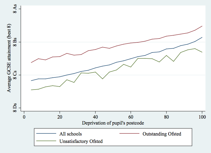 How do high quality schools, as judged by Ofsted, do on the social mobility challenge? This chart here shows that Ofsted-judged outstanding schools are pretty good social levellers, on average (i.e. they are much better than the average school for poor children but only moderately better than the average school for rich children)…