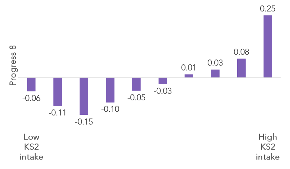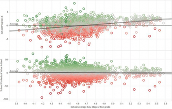 Value-added or progress measures purport to fix this by comparing a student’s attainment to those who had a similar prior attainment. This seems fair on schools, right? It doesn’t seem terrible, until you observe that schools with high attaining intakes have high progress scores and those with lower attaining intakes have lower progress scores, on average.